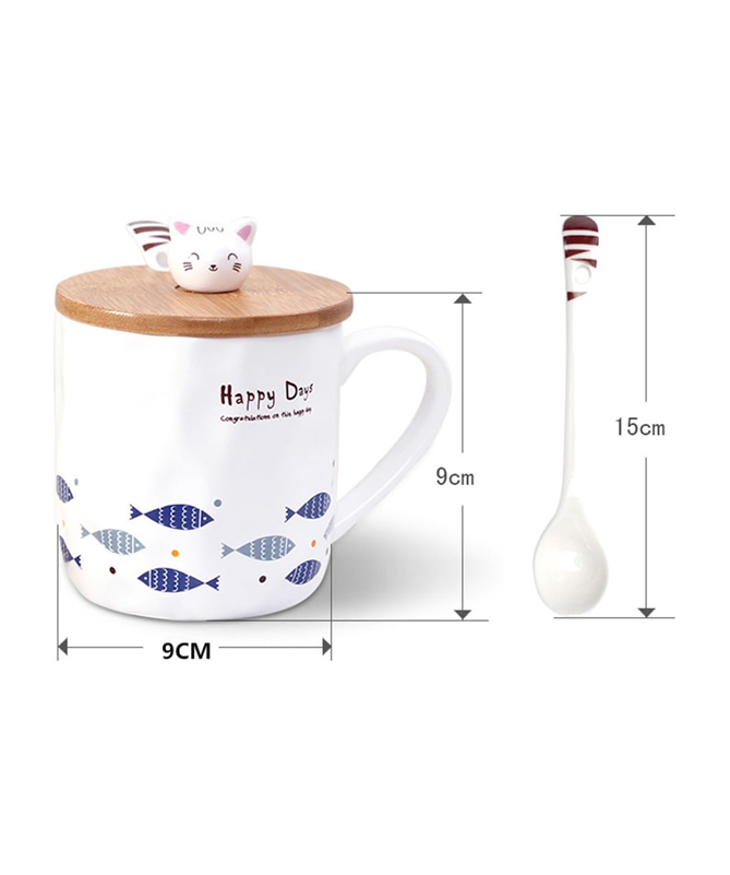 Taza de Cerámica de 14 oz, Diseno de peces, Incluye Tapa y cuchara.